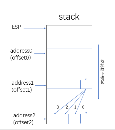 下图是一个简单的栈地址空间图,offset表示格式化的参数位置。通过第offset0个参数,利用%hhn可以控制address1的最低位,再通过第offset1个参数,利用%hhn可以写address2的最低位;然后通过offset0参数,利用%hhn修改address1的最低位为原始值+1,再通过offset1参数,利用%hhn可以写address2的次低位;依次循环即可完全控制address2的值,再次利用address1和address2的链式结构,即可实现对address2地址空间的任意写。对应到上面显示的地址空间,address0=0xffb5c308,offset0=0x18/4=6;address1=0xffb5c328,offset1=0x38/4=14;address2=0xffb5c358,offset2=0x68/4=26;