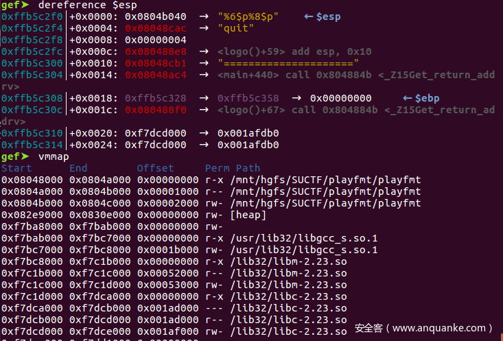 首先需要得到当前栈的地址和libc的基地址,这些地址可以很轻松的在栈上找到,其中esp+0x18存放了栈地址,esp+0x20存放了libc的地址,可以得到分别是第6个参数和第8个参数,直接传入%6$p%8$p即可得到栈地址和libc地址。