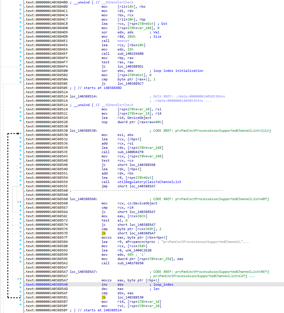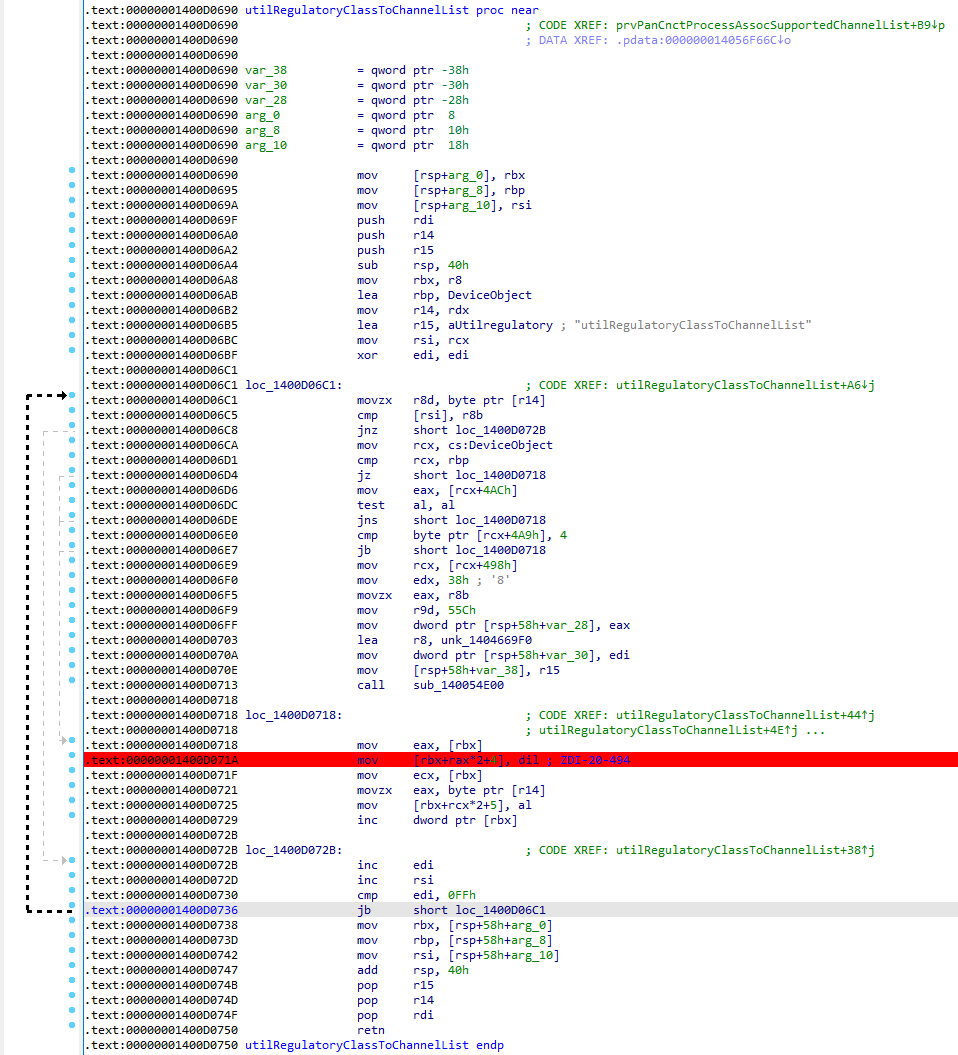 驱动程序调用两个函数来处理信息元素:prvPanCnctProcessAssocSupportedChannelList()和utilRegulatoryClassToChannelList()。prvPanCnctProcessAssocSupportedChannelList()尝试调用函数utilRegulatoryClassToChannelList()221次,与元素长度相对应。以下是来自nettw04.sys驱动程序19.51.23.1版本的prvPanCnctProcessAssocSupportedChannelList()函数的反汇编代码段: