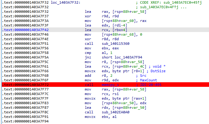 漏洞函数prvhPanClientSaveAssocResp()使用错误的DstSize参数通过memcpy_s()将SSID复制到固定长度的堆缓冲区中。它提供了攻击者提供的SSID长度,而不是目标缓冲区的大小。下面是来自驱动程序20.70.13.2版本的prvhPanClientSaveAssocResp()函数的反汇编代码片段。