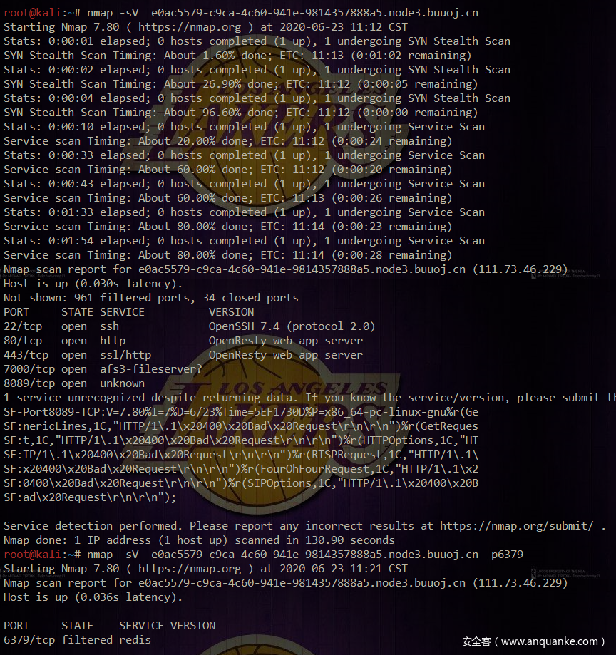 这个IP的其他端口有问题?不多说,nmap一把梭看看有哪些常见==问题端口== 很骚的一个点就是nmap如果不强调-p-参数`或者指定端口貌似不会扫6379 端口的,也就是redis 端口,而这个无疑是问题端口中的问题端口,因此可以指定扫6379端口:
