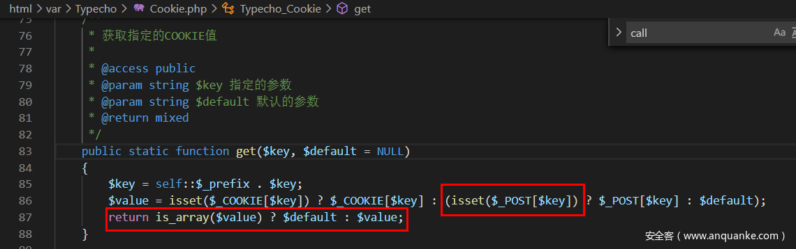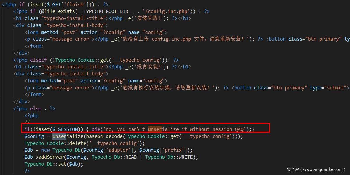 当设置了session后,会对Typecho_Cookie::get('__typecho_config')base64解码后反序列化,先回溯一下:
