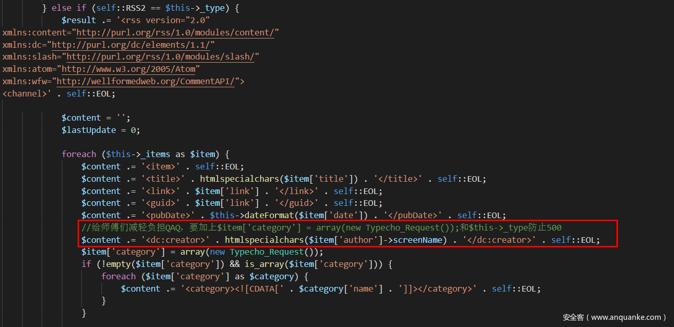在Typecho_Feed类中找到标记的语句,还有出题人的提示QAQ,这里调用了$item['author']->screenName,如果该类是一个不能存在screenName属性的类的话,那么这里就会调用这个类的__get()魔术方法,在Request.php中发现了这么一个魔术方法,