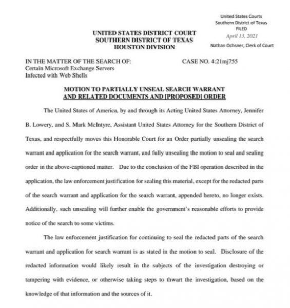 3月2日,微软发布了Microsoft Exchange Server的安全更新公告,其中包含多个Exchange Server严重安全漏洞,危害等级为“高危”。并且已经受到了一个名为Hafnium的国家支持的黑客组织的攻击。微软第一时间修复这些漏洞,但发布的补丁并未关闭已经遭入侵的服务器的后门,其他黑客组织几天后纷纷开始效仿,纷纷针对Exchange服务器进行攻击。该安全漏洞使全球多个国家或地区的企业、政府机构、教育机构以及医疗机构等出现严重的信息泄露问题。因此,美国司法部于4月13日宣布一项由美国休斯敦法院授权的行动,批准FBI利用黑客方式删除Exchange Server后门程序。