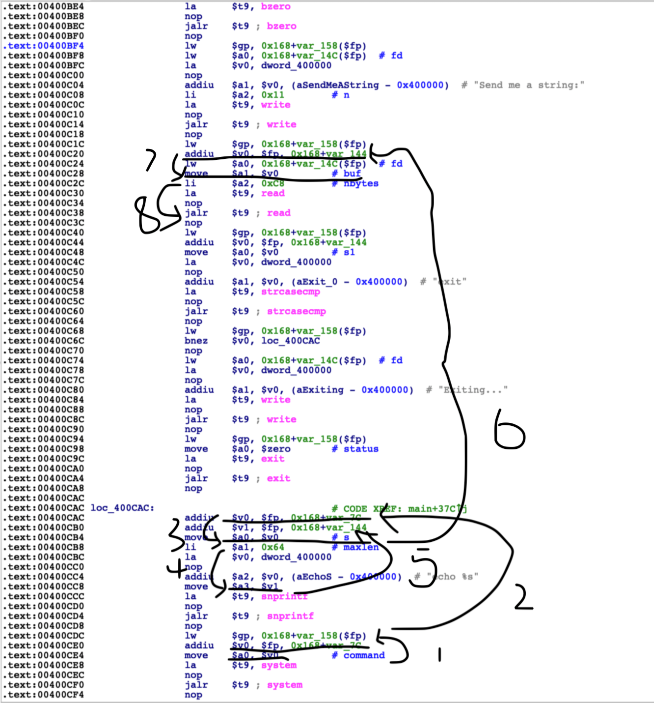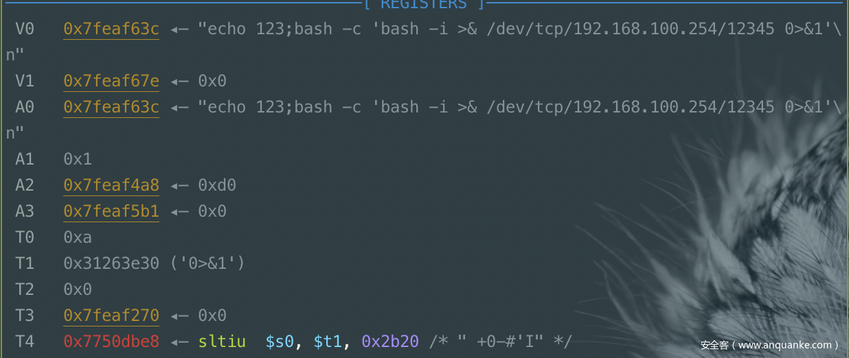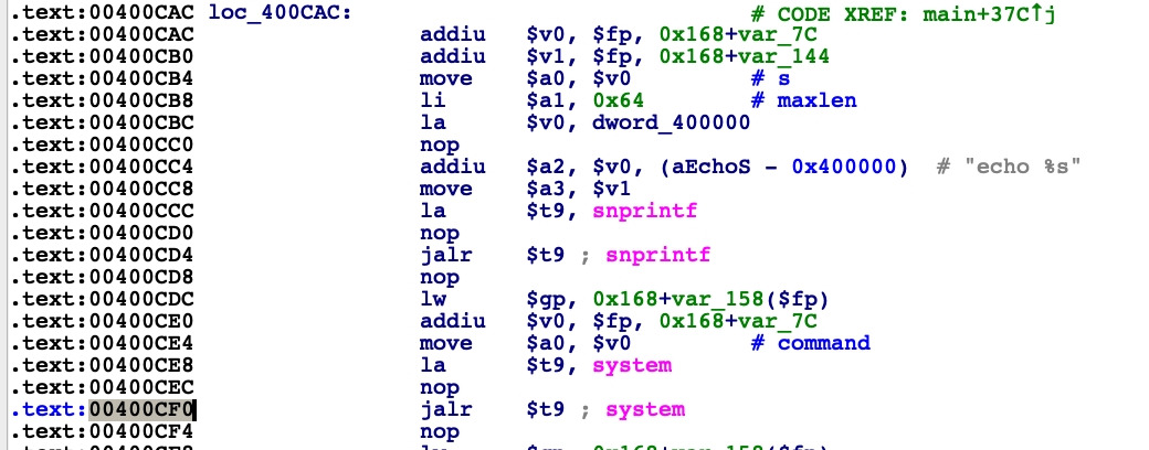 然后我们接着下断点到0x400CF0,执行在本地调通的脚本,将ip和port修改一下,看system执行的命令,