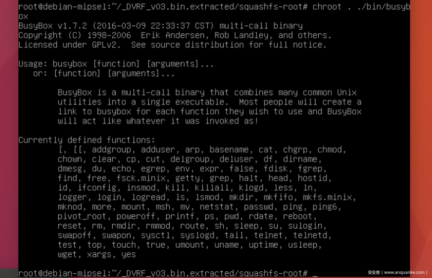 4.我们接下来修改一下利用脚本,主要目的是利用固件中已有的指令去反弹shell。我们首先用busybox查看一下支持哪些指令,如下: