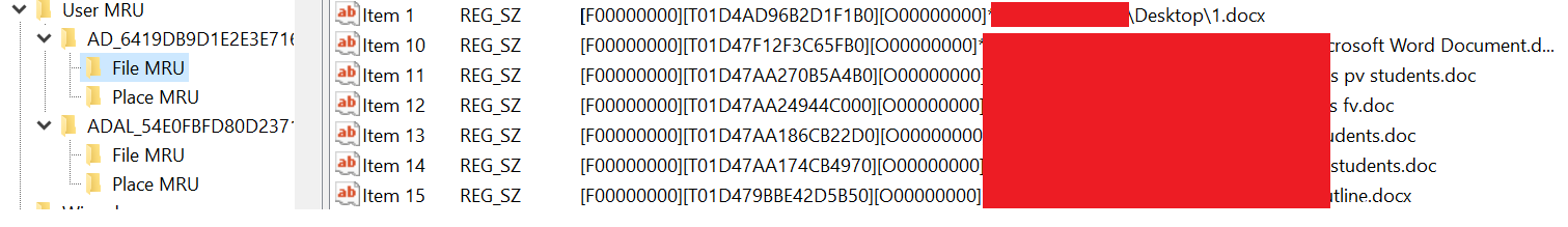 检测注册表键值来分析MRU记录(\HKEY_CURRENT_USER\Software\Microsoft\Office\16.0\Word\User MRU):