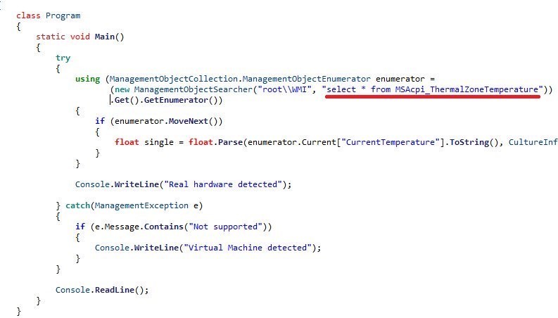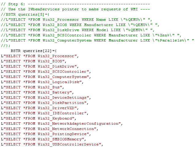 代码用到了系统中的一个WMI调用,这种方法比较有趣,因为VM系统在调用语句后不会返回结果数据。