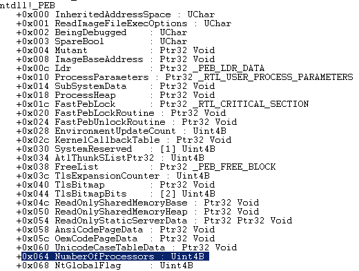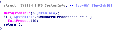 像Win32/Dyreza之类的恶意软件家族会计算CPU核心数量作为检测策略。最早时研究人员观察到一些恶意软件家族会使用前文提到过的比较简单的API来计算CPU核心数,然而随着时间的推移,大多数恶意软件家族选择使用WMI以及更为隐蔽的基于PEB的方法。