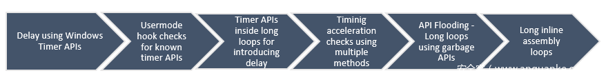 在早期阶段,研究人员观察到有多款恶意软件会使用基于时间的规避技术,利用已知的一些Windows API(如NtDelayExecution、CreateWaitTableTImer、SetTimer等)来延迟执行恶意代码。在沙箱环境开始识别并防御之前,这些技术依然非常受攻击者欢迎。