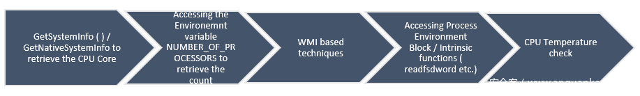 另一篇文章中介绍了获取CPU核心数的一些较新技术。根据我们的观察,我们梳理了恶意软件在获取CPU核心数上的技术演进过程,如下图所示: