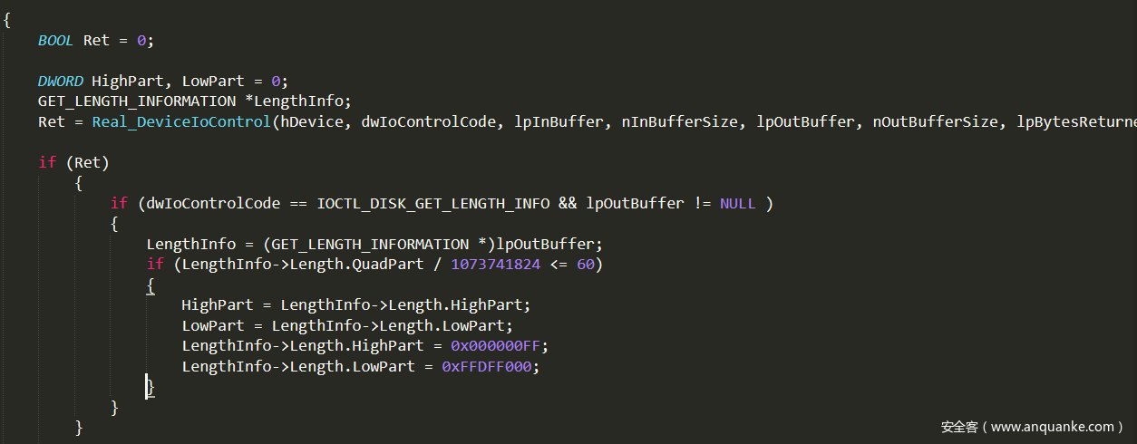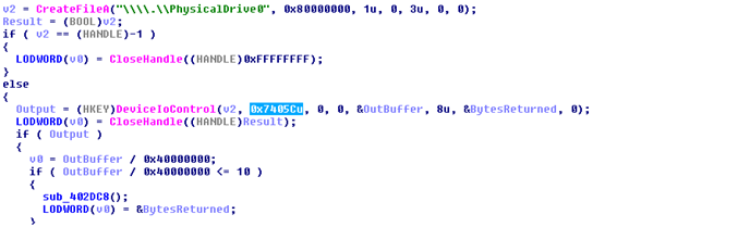 这些方法在某些恶意软件家族中非常流行,比如Win32/Phorpiex、Win32/Comrerop、Win32/Simda等。根据我们对这些变种的跟踪,我们注意到恶意软件会将DeviceIoControl() API与特定的控制代码一起使用,获取存储类型及存储大小的相关信息。