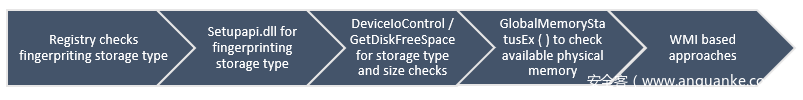 识别硬件指纹是恶意软件所广泛采用的另一类规避策略,恶意软件会重点检查物理内存总量、可用硬盘大小及类型以及可用的CPU核心。