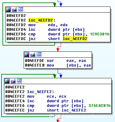在Win32/Cutwail恶意软件中,我们观察到后续不断被使用的一种方法,那就是在循环中调用无用的API来引入执行延迟,这也就是所谓的API Flooding(API洪泛)技术。使用该方法的恶意软件代码片段如下所示: