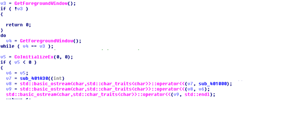 比如,Win32/Gataka变种会使用GetForeGroundWindow来检查是否有对这个API的其他调用操作,判断窗口句柄是否发生变化。研究人员也在Locky勒索软件变种中发现过这种技术。