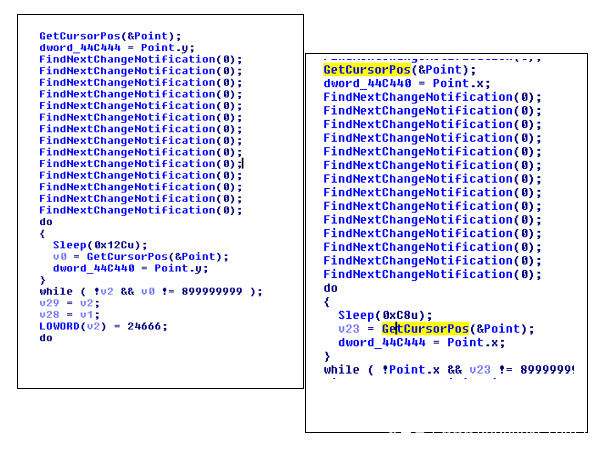 Win32/Sazoora恶意软件的部分代码片段如下所示,这款恶意软件会检查鼠标移动轨迹,这也是其他几款恶意软件家族广泛使用的一种技术。