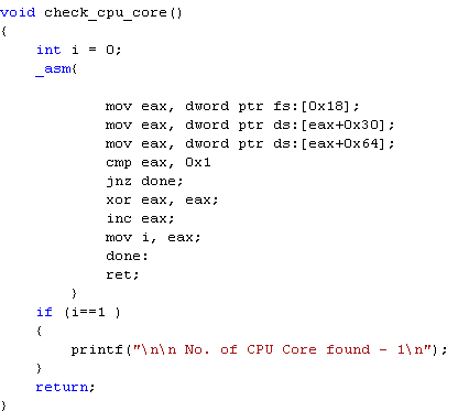 还有其他方法能够获取CPU核心数,更为隐蔽的方法是访问PEB,可以引入如下内联汇编代码或者使用内部函数来实现: