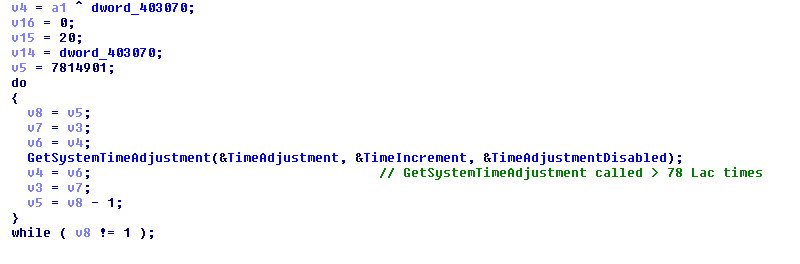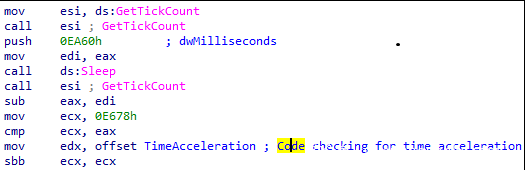 当沙箱检测到恶意软件,想通过加速代码执行的方式防御恶意软件时,攻击者也开始通过多种方法来识别环境中的加速执行机制。有多款恶意软件家族(包括Win32/Kovter)会在代码中使用GetTickCount这个Windows API来判断代码运行时间是否匹配预期时间,我们也在一些恶意软件家族中看到该方法的一些改进版。