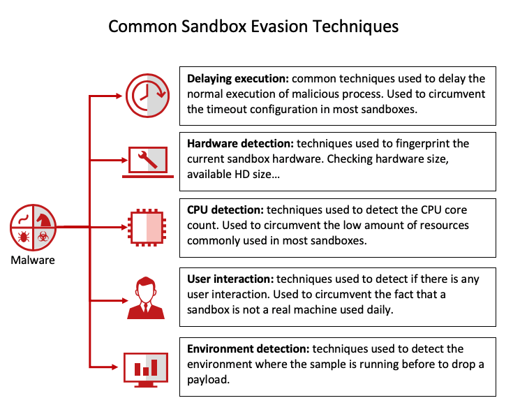 在本文中,我们将重点关注恶意软件最常用的一些规避技术,如下图所示。此外恶意软件还用过其他一些技术,这里没有全面覆盖。