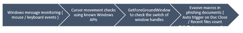 恶意软件开发者还会使用其他技术来规避沙箱环境,比如用户交互过程,这是因为自动化分析系统永远不会与真实用户进行交互。传统的沙箱在设计上并没有去模拟用户行为,因此恶意软件在开发过程中加入了相关代码,用来检测自动化系统与真实系统之间的差异。最初有多款恶意软件家族会监控Windows事件,在这些事件生成之前保持挂起状态。