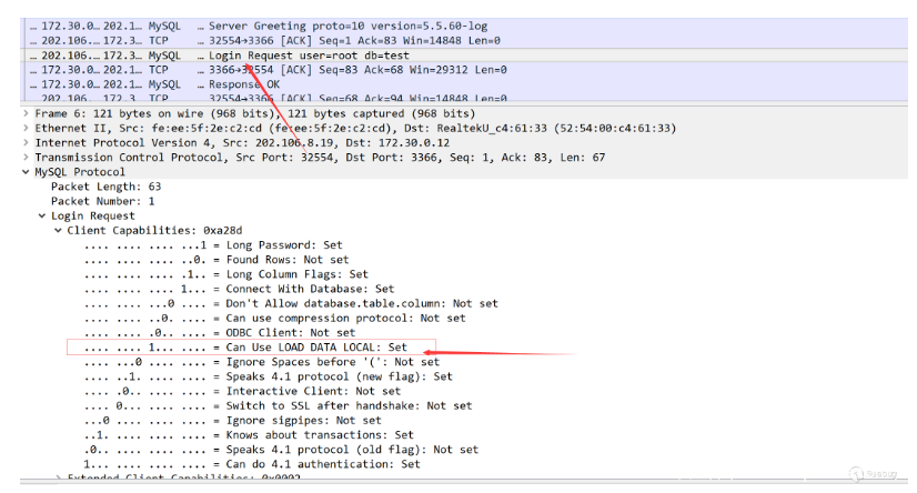 在greeting包之后,客户端就会链接并试图登录,同时数据包中就有关于是否允许使用load data local的配置,可以从这里直白的看出来客户端是否存在这个问题(这里返回的客户端配置不一定是准确的,后面会提到这个问题)。