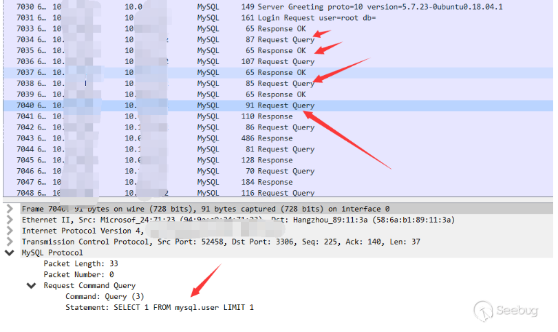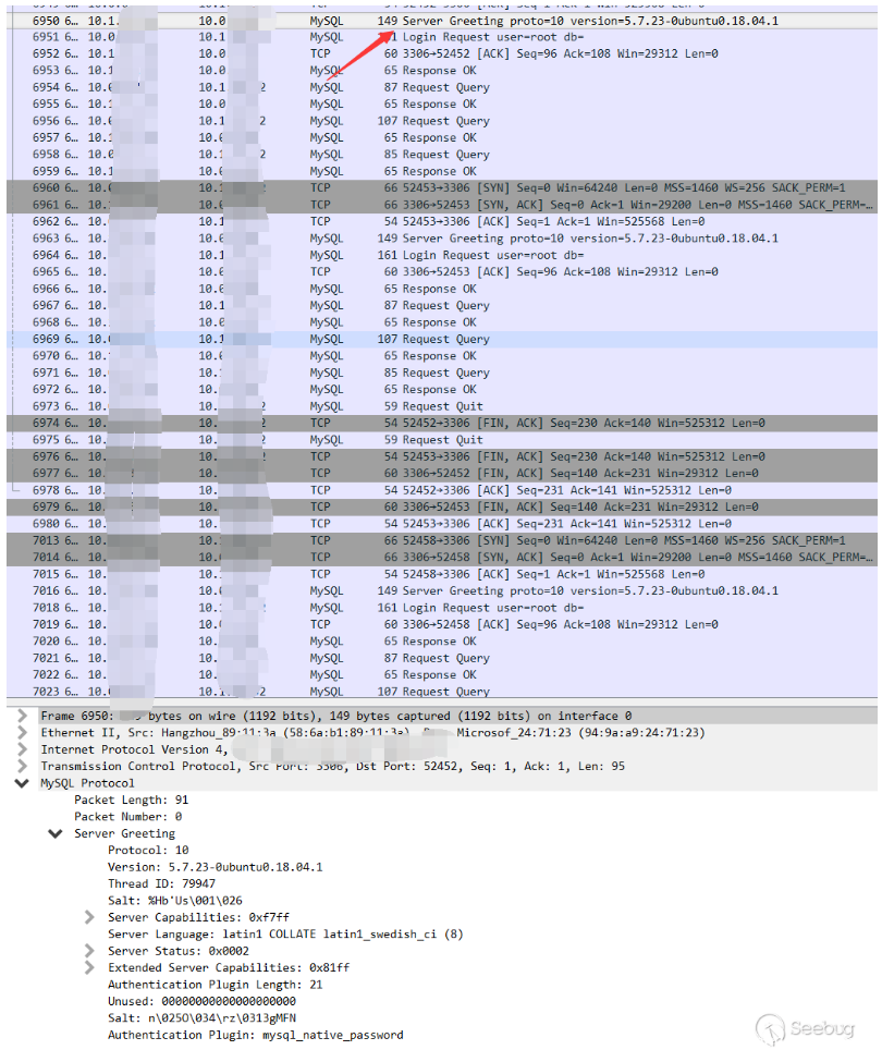 在搞清楚这个问题之前,我们需要研究一下mysql正常执行链接和查询的数据包结构。