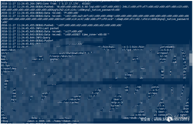 在想明白原理之后,构建恶意服务端就变得不那么难了,流程很简单 1.回复mysql client一个greeting包 2.等待client端发送一个查询包 3.回复一个file transfer包
