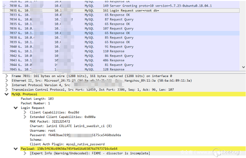 值得注意的是,原作者给出的poc并没有适配所有的情况,部分mysql客户端会在登陆成功之后发送ping包,如果没有回复就会断开连接。也有部分mysql client端对greeting包有较强的校验,建议直接抓包按照真实包内容来构造。