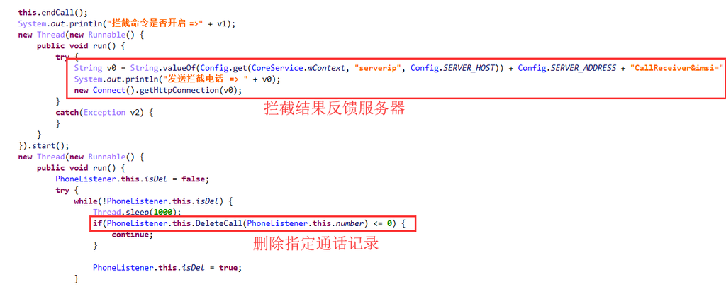 开机时自启动,隐藏安装图标,激活设备管理器,屏蔽拦截短信、屏蔽挂断指定电话、上传通话录音文件、删除通话记录。