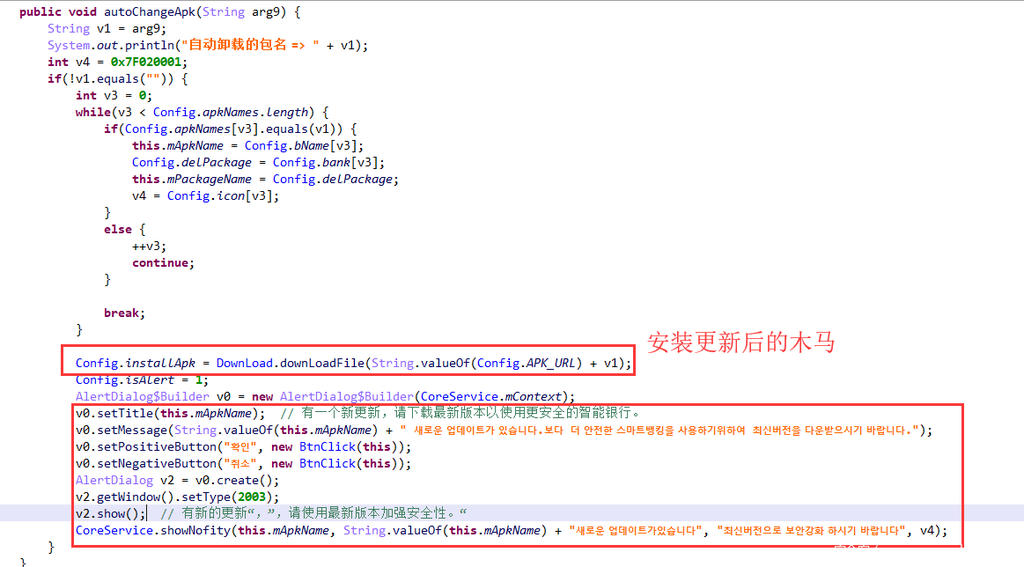 接收到指令“changeapp”,卸载并更新木马版本(指定的仿冒银行木马):