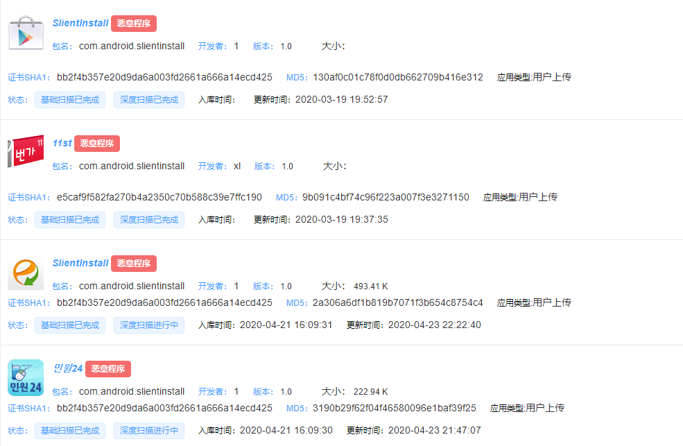 在恒安嘉新 App全景态势与案件情报溯源挖掘平台上,通过应用名称、包名等特征关联搜索相关样本,发现平台上存在大量新型间谍木马类恶意应用,其中,该类恶意程序代码结构、包名及其类似,极有可能是同一批人开发。