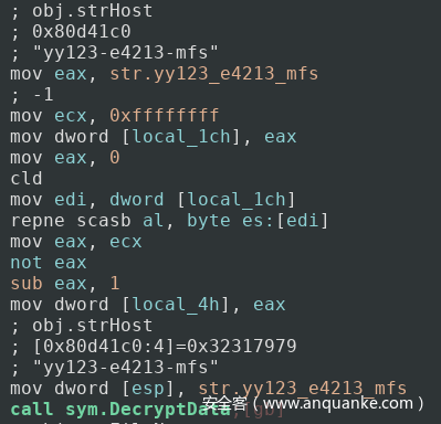 从代码注释中,我们可以看到名为strHost的一个字符串,同时我们也知道strHost作为参数被传递给DecryptData函数。据此我们可以猜测,strHost中可能会保存恶意软件需要连接的某些主机名或者地址信息,DecryptData会解密这个字符串,解析出正确结果,还原“yy123-e4213-mfs”对应的真实值。现在,我们可以跳转到DecryptData,分析代码内容。