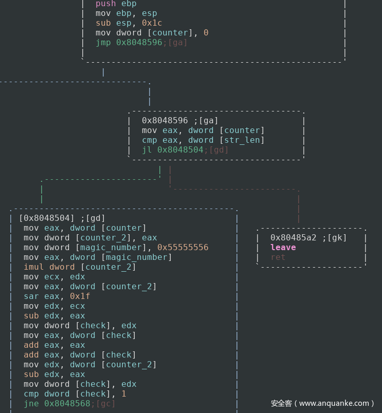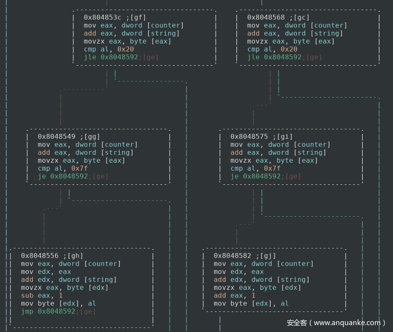 首先,我们可以看到某个计数器变量被赋值为0(请注意:我使用afvn命令重命名了该函数中的所有变量,以便后续分析)。接下来,代码开始循环检查计数器变量值是否小于字符串的长度(即以参数传入的字符串)。如果小于字符串长度,则会跳转到该循环对应的主逻辑代码中。
