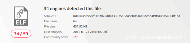从结果中可知,59家厂商中只有34家成功识别出这一款恶意软件,考虑到这是一个Linux程序,这个结果也比较正常。该程序没有经过封装,VirusTotal的分析结果中也没有给出特别有趣的信息。接下来,我通过rabin2工具获取了该样本的一些基本信息,如下所示: