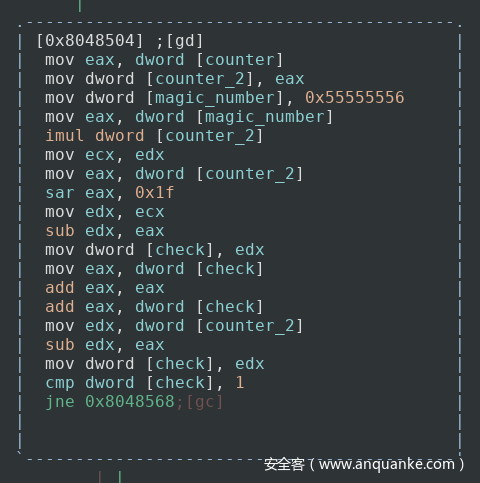 如果你在逆向分析方面不是特别熟练,这段代码看起来可能比较复杂,这里我会详细介绍这段代码的功能。程序会将字符串的当前索引传递给另一个计数器变量(不要去纠结作者为什么这么做,有许多方法可以完成这个任务),然后使用0x55555556这个十六进制数来声明一个新的变量,这个值充当了“魔术数”(magic number)角色,可以提高除法运算的性能。这个数字对应的十进制数值为1431655766。如果我们将某个数乘以这个数,然后将结果逻辑右移32位,所得的结果与原数除以3的结果相同。虽然这是我第一次看到这个魔术数,我会尽力去解释这个过程,因为该过程的确非常有趣。