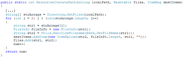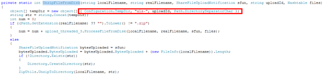 再来看一下上传逻辑,当文件解压到临时目录后,代码调用了UploadLogic.RecursiveIteratePath函数,该函数会将所有文件递归添加到攻击者的ShareFile账户中(为了便于阅读,我删掉了某些代码):