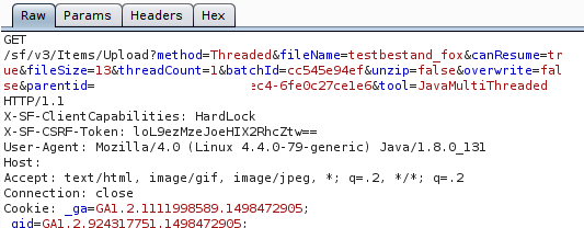 在了解应用整体情况以及工作流程后,我们决定研究上传流程以及云端与ShareFile本机端组件的连接情况。一般来说,我们可以采用两种方法将文件上传到ShareFile中:一种基于HTML5,另一种则是基于Java Applet。在接下来的例子中,我们使用的是基于Java的上传方式。我们进行了一些配置,使得Burp可以捕捉到所有请求(Burp是我们用来测试Web应用的首选工具)。当准备上传时,会有一个请求发送到ShareFile的云组件,该组件地址为name.sharefile.eu(其中name为采用该解决方案的公司名称):