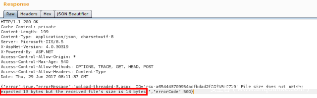 从上图中可知,该请求包含上传信息,具体包括文件名、文件大小(字节数)、上传所使用的工具(本例中为Java上传器)以及我们是否愿意执行unzip操作(后面会解释这一点)。该请求返回的响应数据如下: