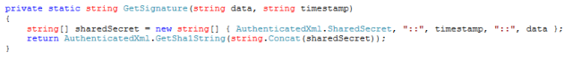 反编译处理后,我们很快就找到了负责验证令牌的那些函数。Citrix通过AuthenticatedXml这个函数生成XML文件的签名。我们在代码中找到了一个静态秘钥,该秘钥可以用来验证XML文件的完整性(所有StorageZone控制器上这个值都一样):