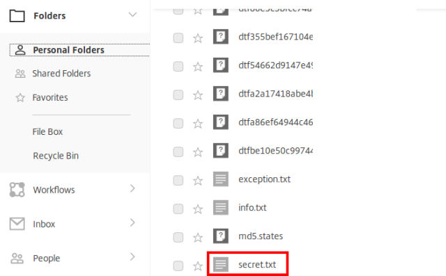 此外,我们发现应用在上传数据时,会使用fi591ac5-9cd0-4eb7-a5e9-e5e28a7faa90这个文件ID作为该文件的临时名称,上传后的数据会写入该文件中。当上传结束时,该文件会加入用户的ShareFile账户中。这里我们来尝试一下另一个路径遍历漏洞。使用上述脚本,我们将文件ID修改成另一个文件名,尝试提取名为secret.txt的一个测试文件(files目录中已经有一个secret.txt文件,files目录是临时文件所在目录的上一层目录)。经过修改的info.txt文件如下所示: