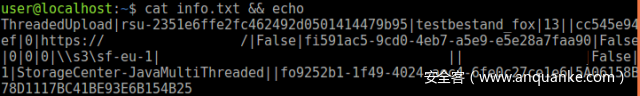 在info.txt中包含我们在前面看到过的一些参数,比如uploadid、文件名、文件大小(13个字节),还包括一些新的参数。最后我们还可以看到包含32个大写字母的的字符串,该哈希字符串用来标识数据的完整性。