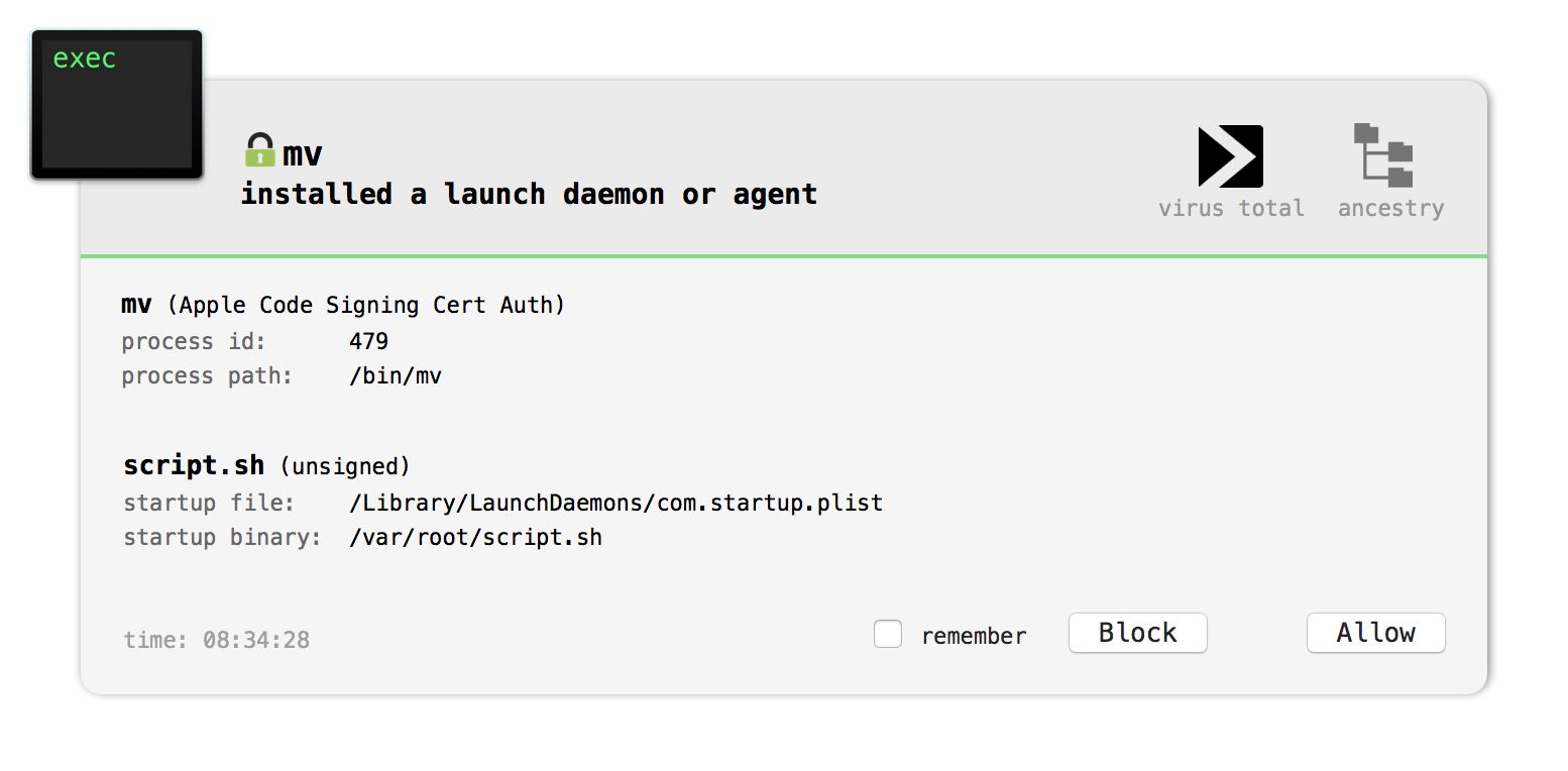 此时,恶意软件已经持久化了一个恶意的启动守护进程。BlockBlock注意到了这一点,它可以检测并警告这个持久性尝试: