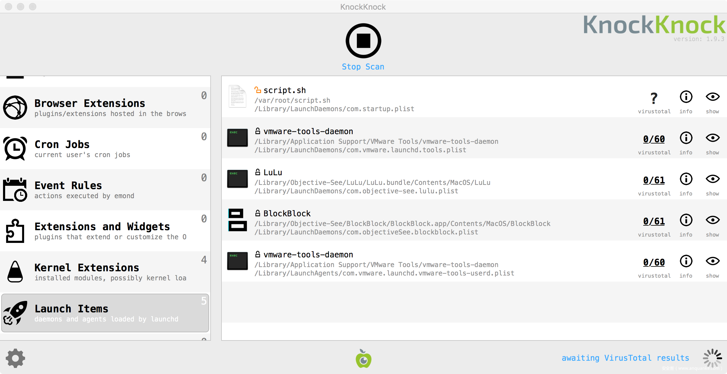 要检查你是否受到感染,可以以root用户身份运行KnockKnock(因为恶意软件集的组件只能由root用户读取)。寻找一个未签名的启动项com.startup.plist执行名为“script.sh”的文件: