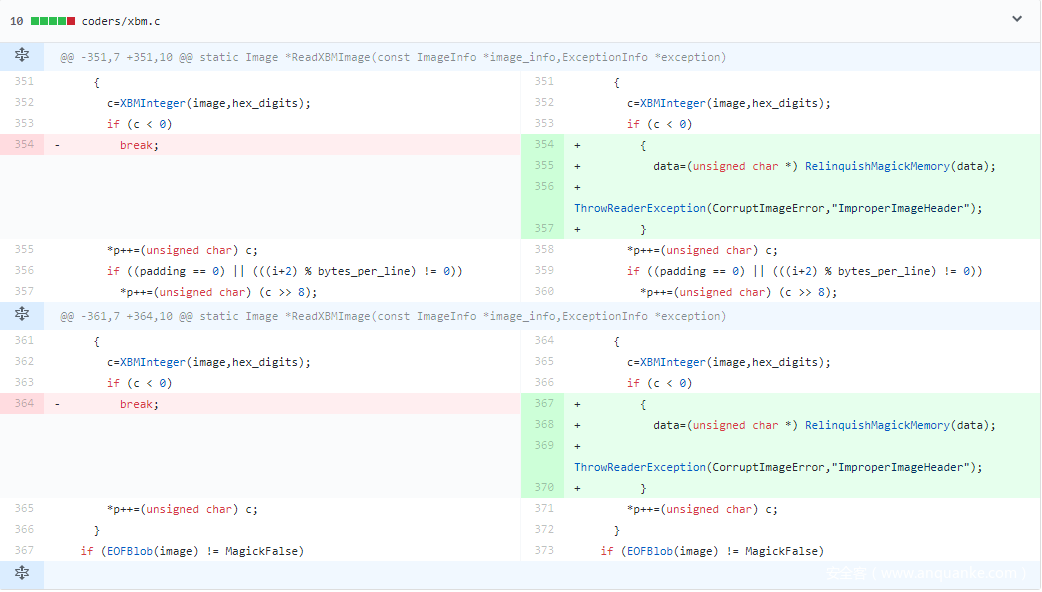 在提交中,我们看到在以前的版本中,如果变量c是负数,则中断循环,这就是出现内存泄漏的原因。如果XBM主体数组的第一个值为负,则所有分配的内存都不会被初始化,就可能包含来自内存中的敏感数据,随后将进一步处理并从该数据生成新图像。在修补后的版本中,如果XBM正文数组的值为负,则ImageMagick会抛出错误。