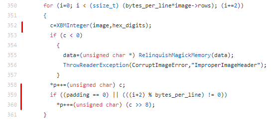 然后,Line 352-360、Line 365-371两段相同的代码用于处理不同版本的XBM图像。从提交日志中可以看出,两个版本的分支受到影响,我们只着眼于其中216d117f05bff87b9dc4db55a1b1fadb38bcb786这个提交。XBM主体数组在XBMInteger()中被读取,然后返回一个整型给变量c。接着在Line 358存储在变量c中的值赋值给指针p指向的地址,然后指针递增。